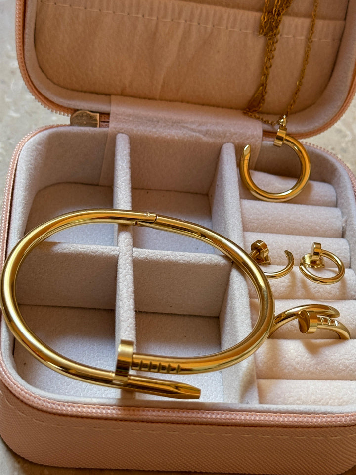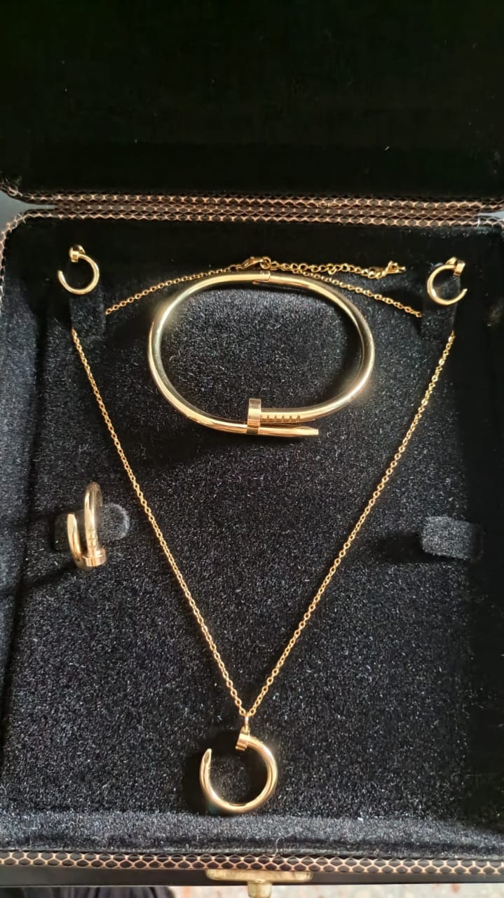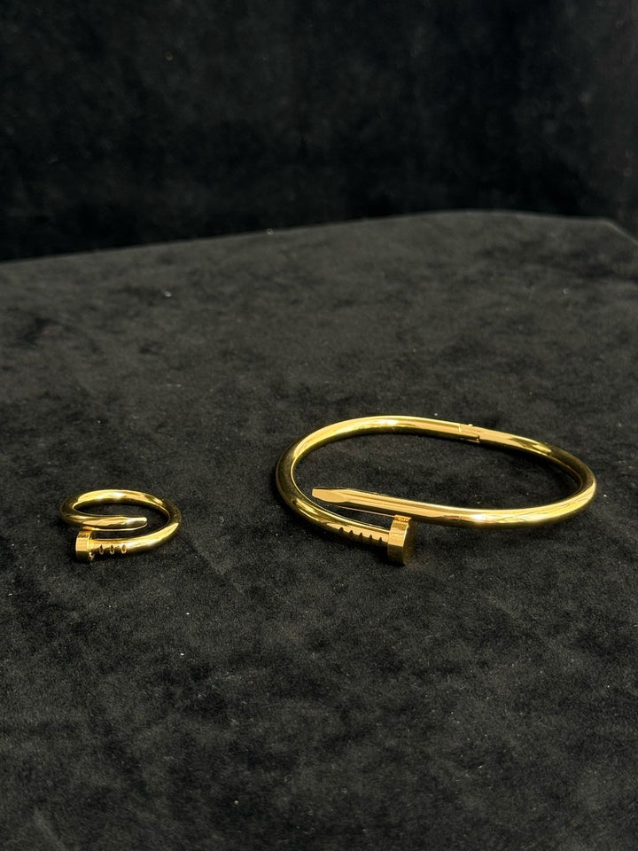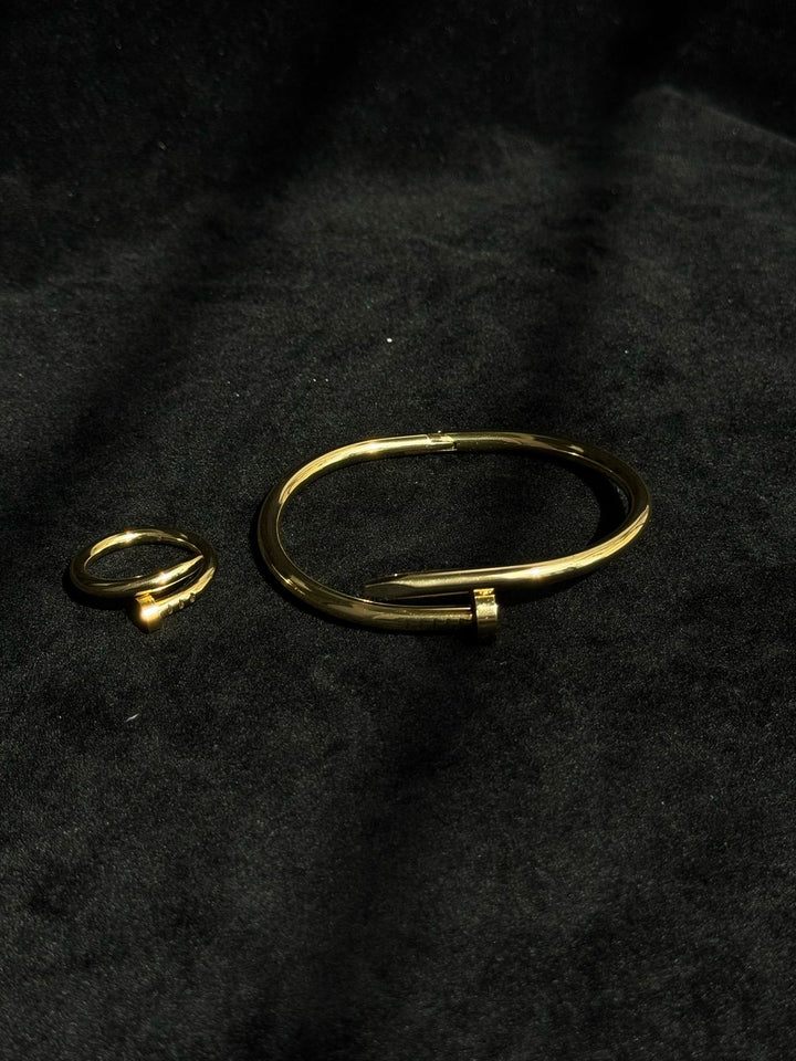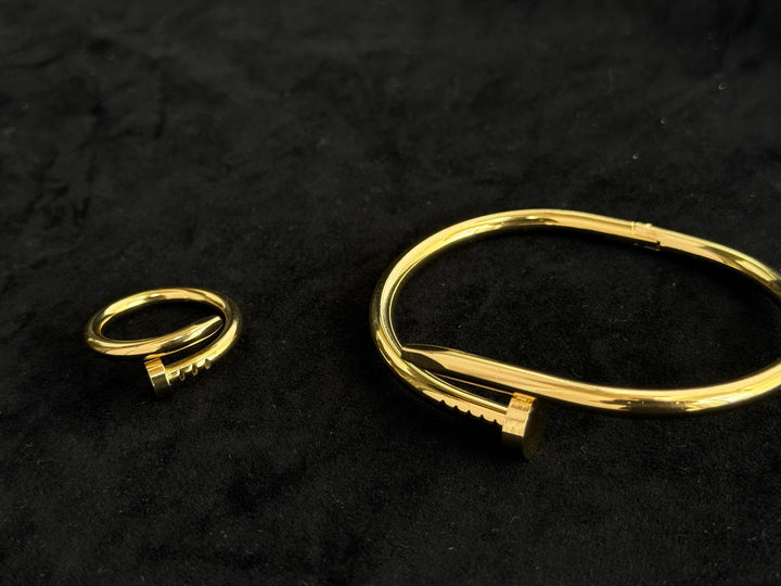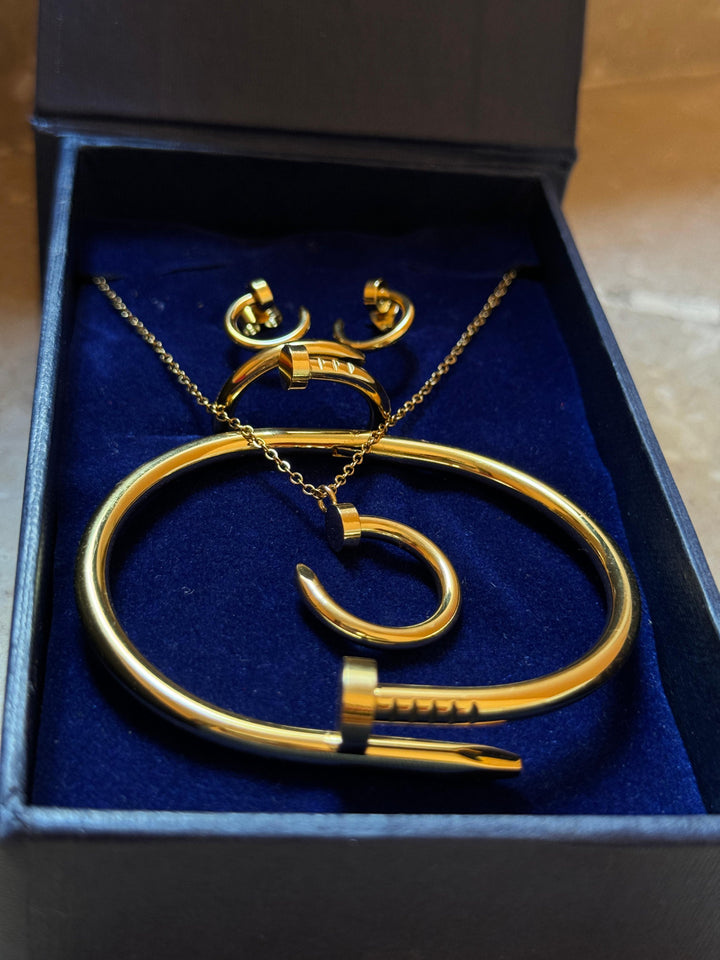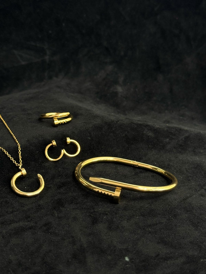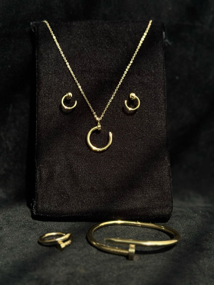 A statement of elegance with a bold edge, the Aurum Luxe Set redefines modern sophistication with its sculpted gold design. The sleek curves embrace the wrist, fingers, and neckline, symbolizing both strength and resilience while maintaining a radiant touch of luxury. Crafted for those who carry confidence effortlessly, this set is the perfect blend of power and grace. Whether worn at festive occasions, formal gatherings, or chic evening outings, the Aurum Luxe Set ensures you leave a timeless impression—bold, radiant, and undeniably chic.
