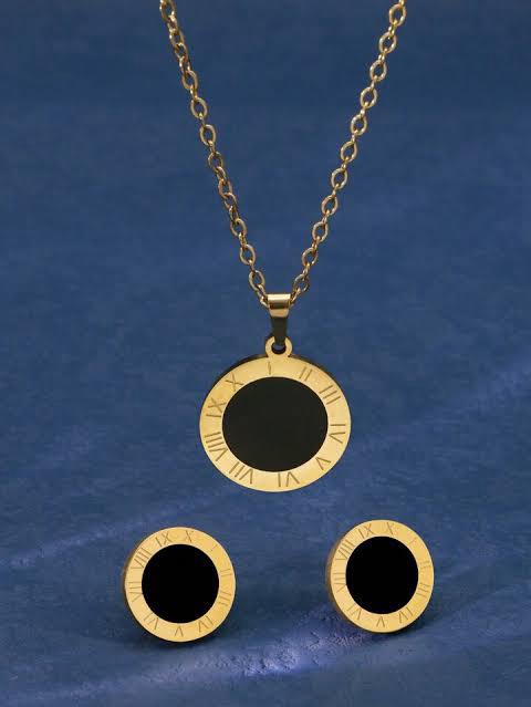 Bold in black and timeless in gold, the Aurum Nero Set strikes the perfect balance between modern edge and classic sophistication. Featuring a sleek enamel centerpiece framed with Roman numeral detailing, this set delivers everyday polish with enduring charm. Crafted from premium stainless steel, it offers durability, shine, and a refined style that lasts. Ideal for both casual outfits and formal attire, the Aurum Nero Set makes a subtle yet powerful statement.