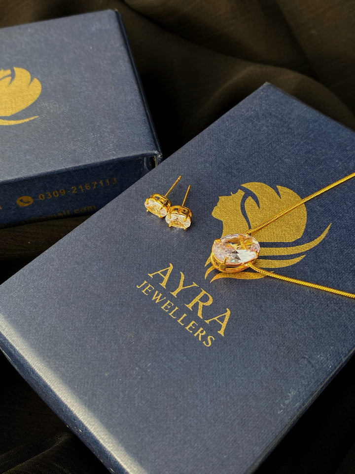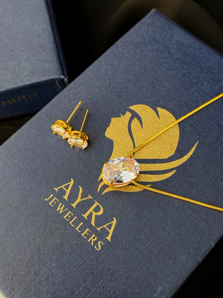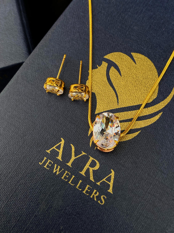 Delicate and dazzling, the Crystal Muse Set is crafted to add effortless sparkle to your style. Featuring a radiant oval-cut stone wrapped in a golden embrace, paired with matching studs and a sleek chain, this set blends shimmer with sophistication. Whether for festive occasions or adding a touch of brilliance to everyday wear, the Crystal Muse Set is your go-to choice for timeless elegance.