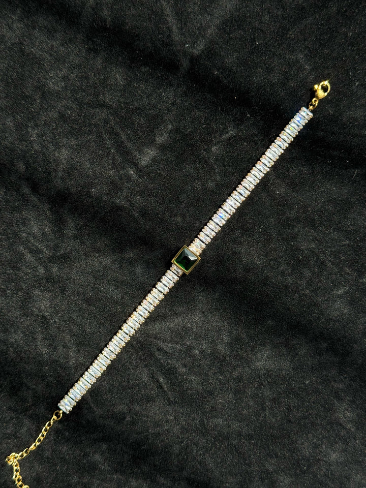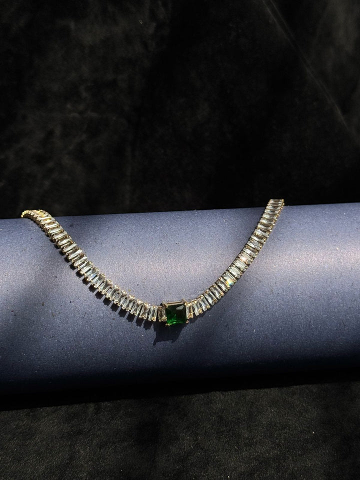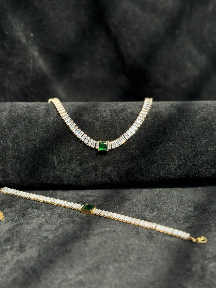 Add instant polish to your style with the Emerald Grace Set, a stunning duo that blends timeless elegance with modern flair. Featuring a delicately crafted necklace and coordinating bracelet, this set is designed to make a statement without losing its refined touch. The radiant green centerpiece brings just the right pop of color, while the sleek baguette-cut stones add sophistication, making it an ideal choice for celebrations, formal gatherings, or chic evening affairs.
