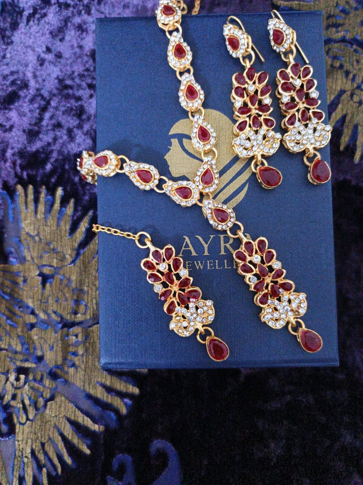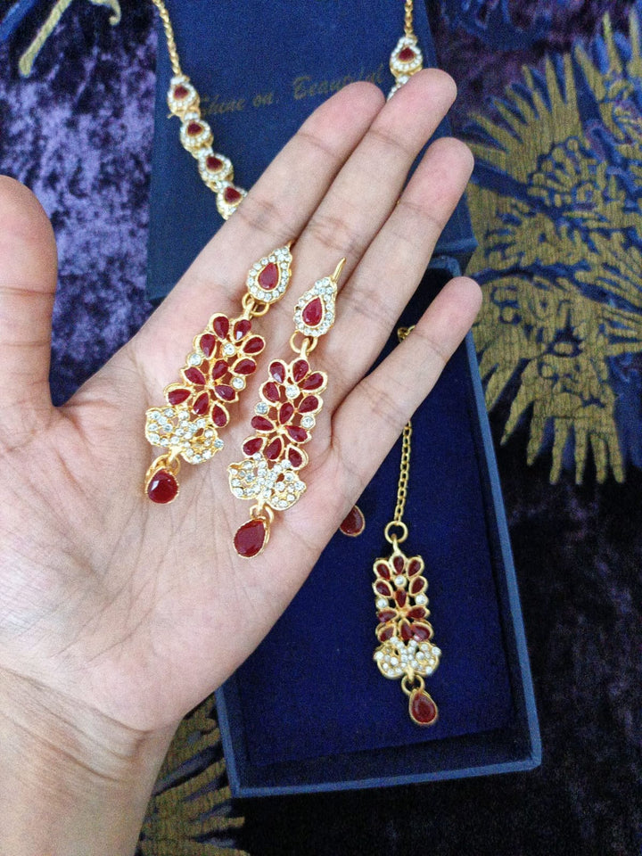 Channel the soft, radiant glow of twilight with the Golden Hour necklace set. Its elegant crimson hues and graceful details are designed to capture attention...