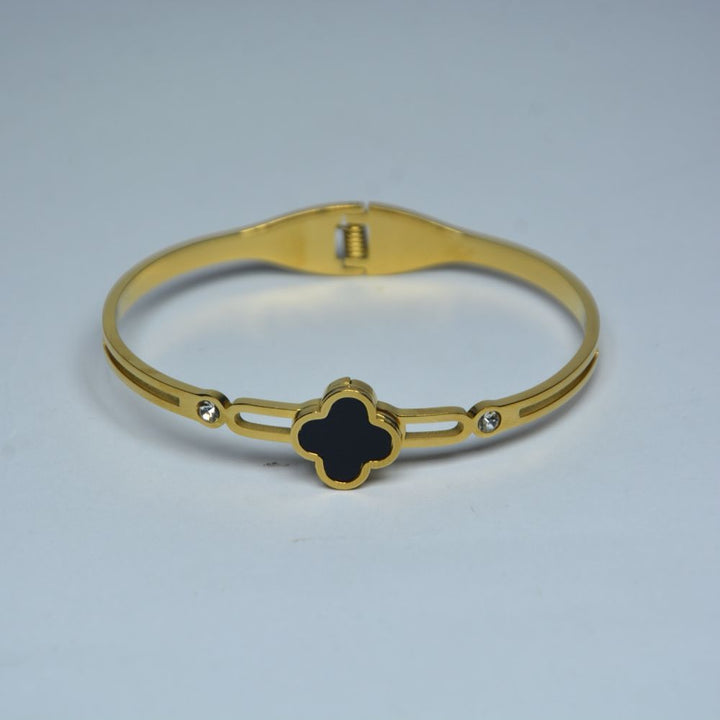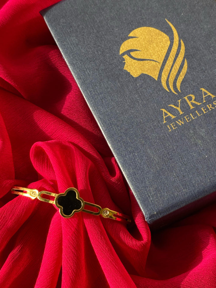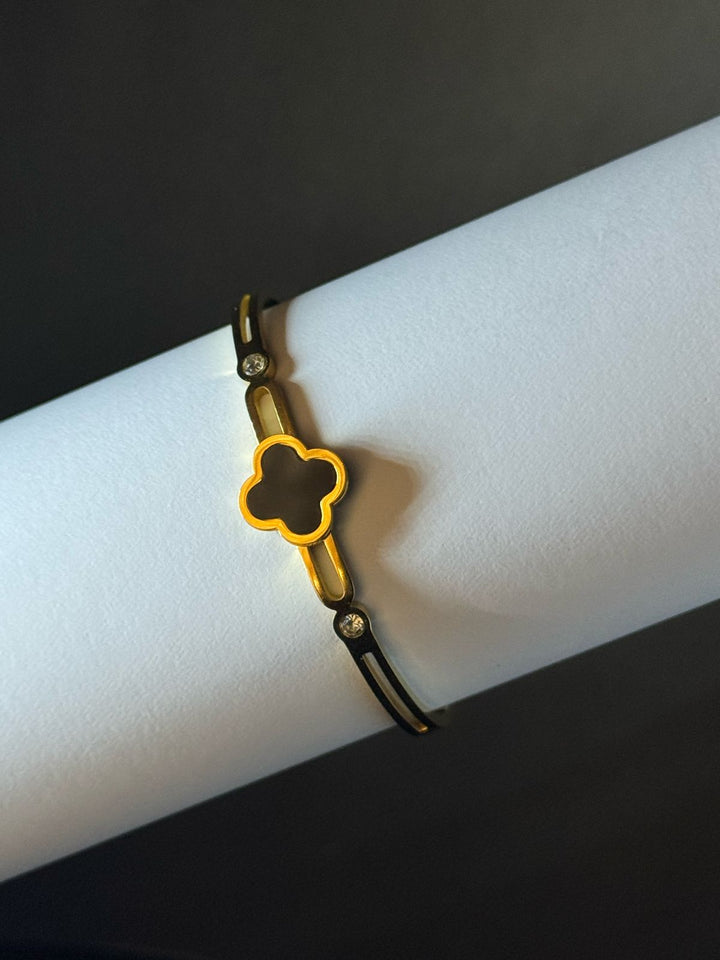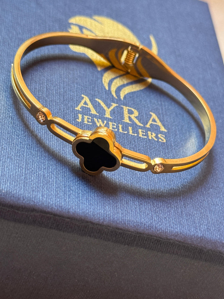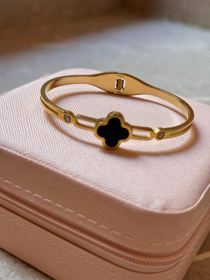 Elegant yet bold, the Midnight Clover Bangle is a symbol of luck and sophistication. Featuring a sleek black clover set in radiant gold, this piece blends timeless charm with a modern edge. Accented with delicate crystal details, it transitions seamlessly from day to night, making it the perfect accessory to elevate both casual and formal looks.