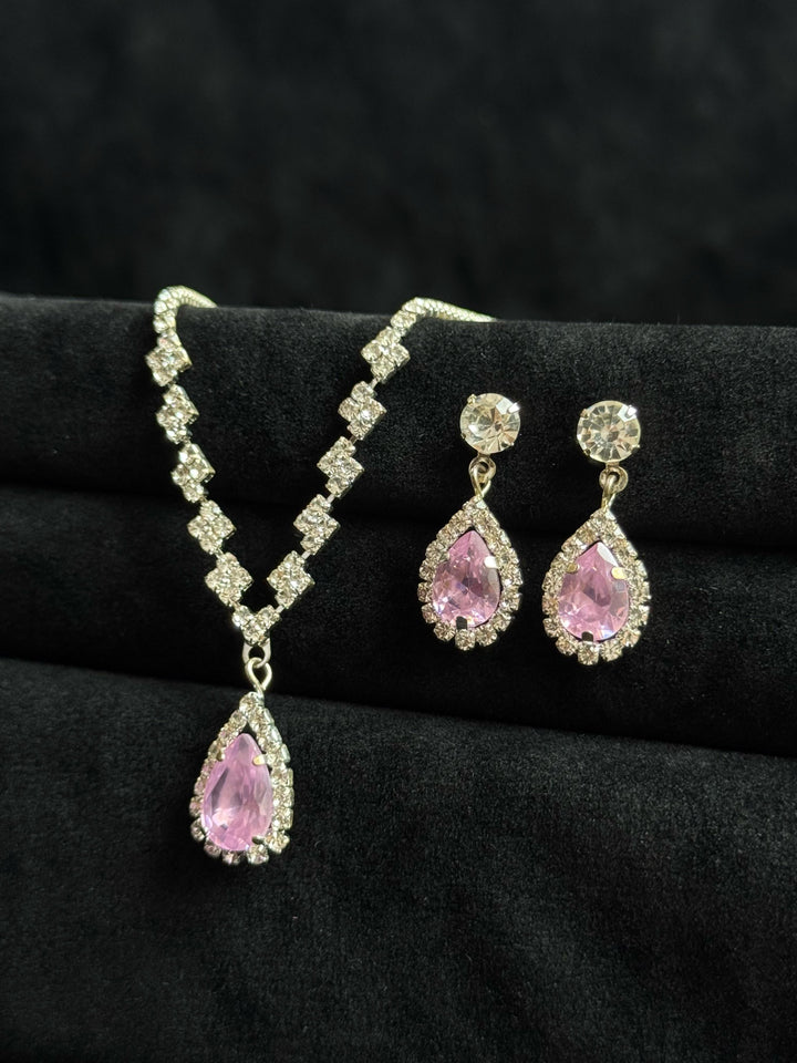 Grace meets glamour with the Rosé Teardrop Set, designed to bring a touch of romance to your style. Featuring a delicate silver-tone necklace and matching earrings, each adorned with a sparkling pink teardrop gemstone, this set blends elegance with charm. Perfect for special occasions or as a chic everyday statement, the Rosé Teardrop Set is a dazzling must-have that elevates your collection with feminine sophistication.