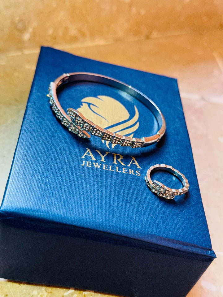 A bold statement of elegance and power, the Serpent Luxe Set is crafted for those who dare to stand out. Featuring a sleek bracelet and ring duo adorned with shimmering zircon stones in a serpent-inspired silhouette, this set embodies both sophistication and edge. The luxurious shine and intricate detailing make it a versatile accessory—perfect for elevating evening looks or adding a touch of confidence to everyday style. Whether worn together or separately, the Serpent Luxe Set is a timeless symbol of strength and grace.