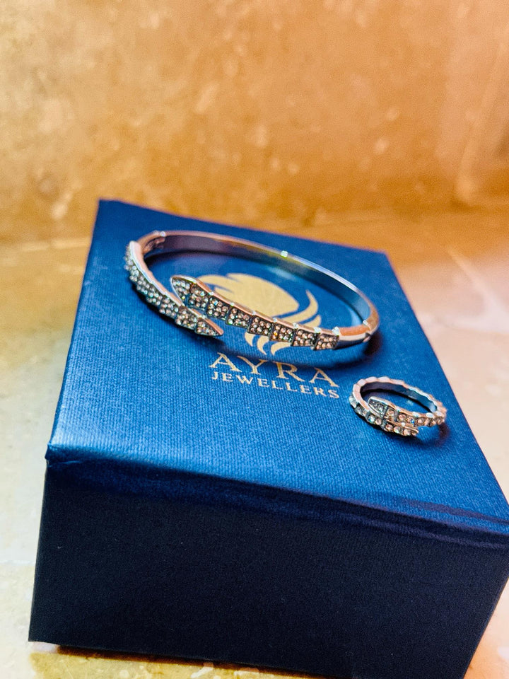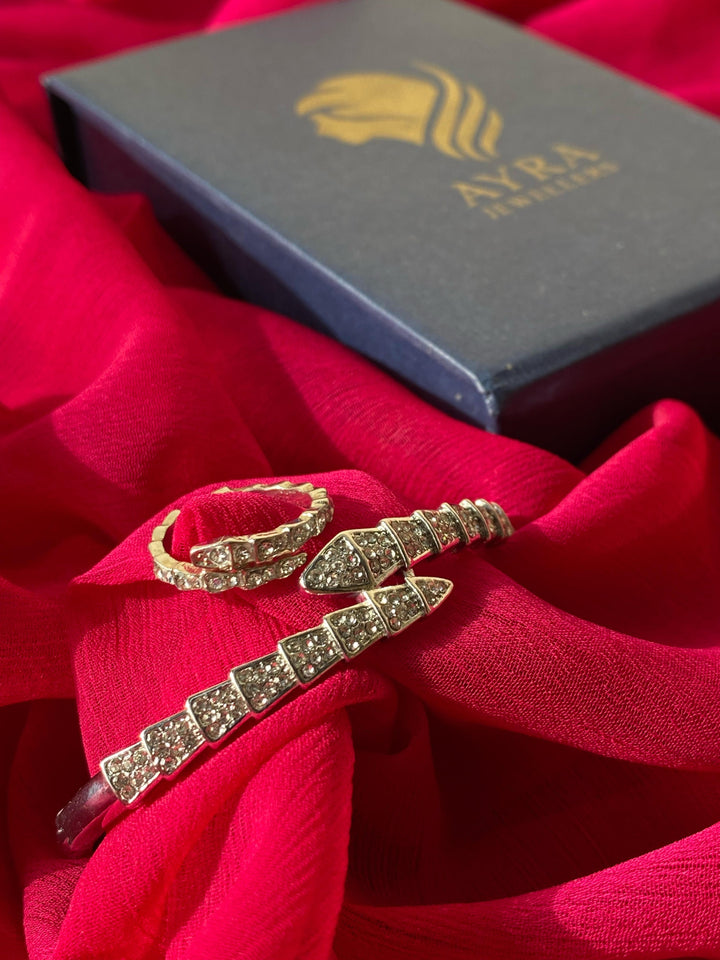 - Sleek bracelet and ring duo with serpent-inspired design